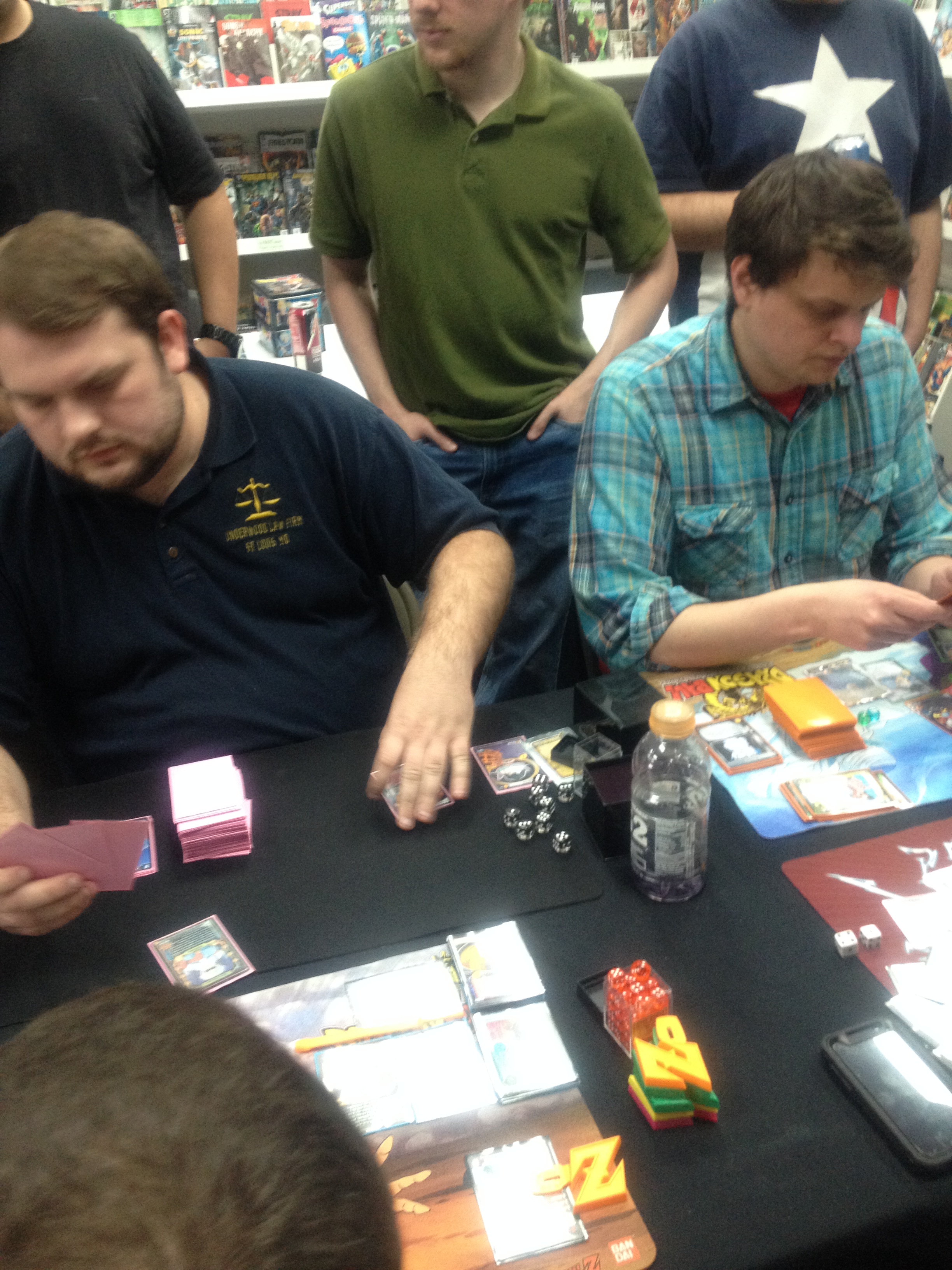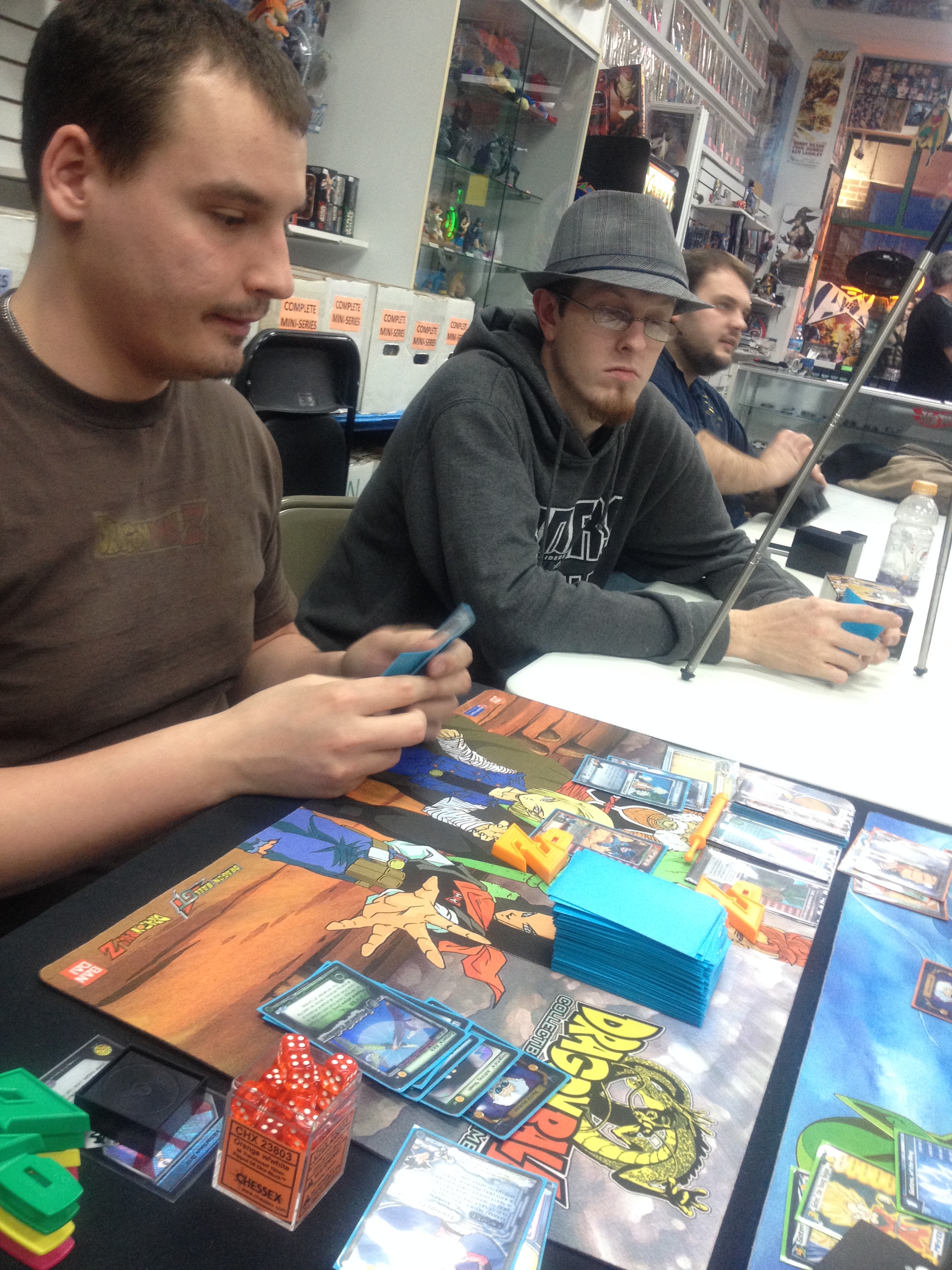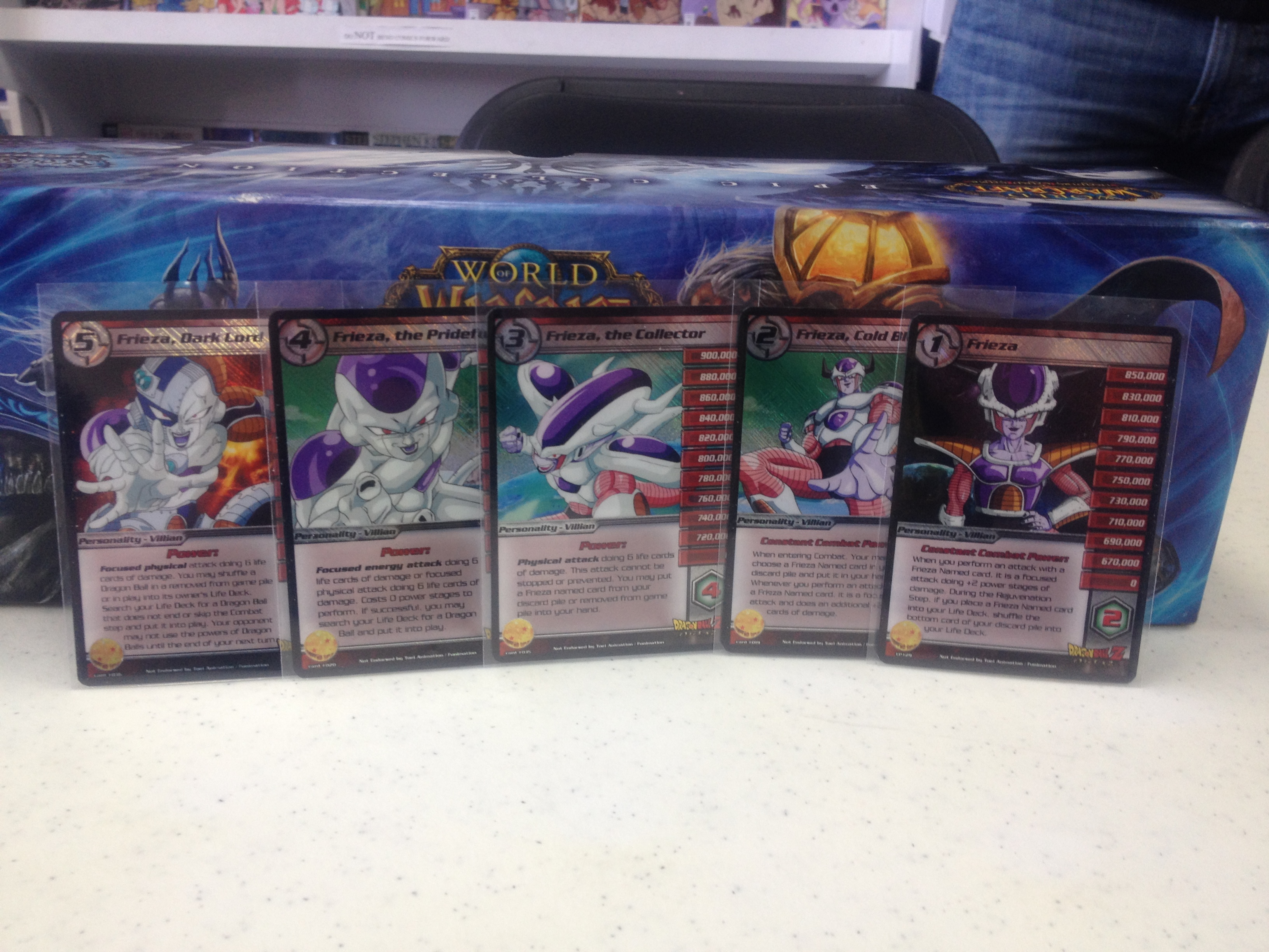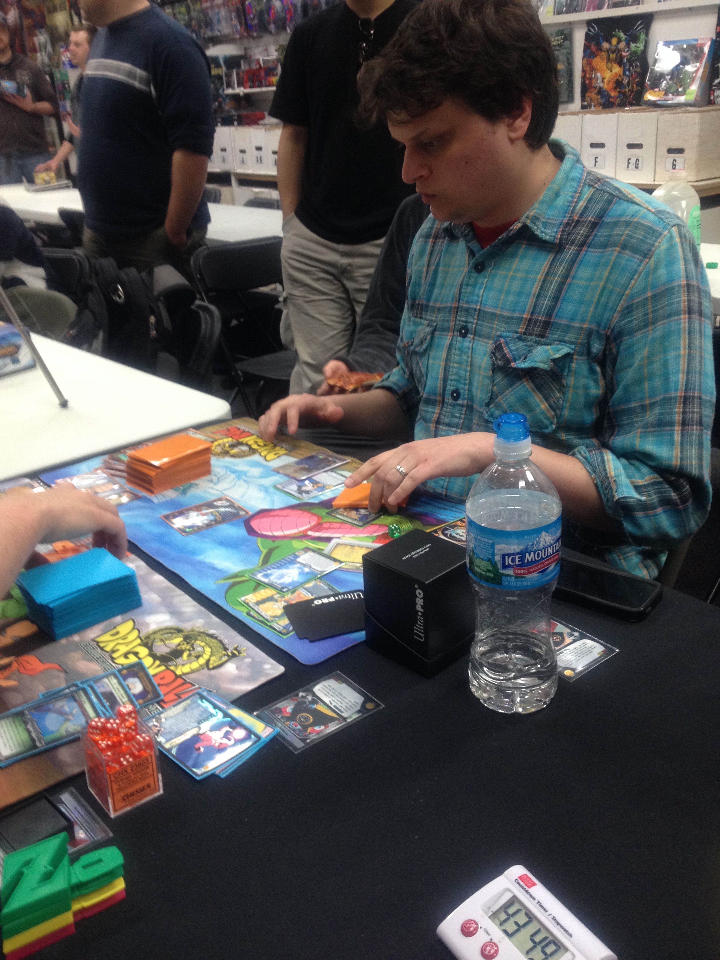 Arik was 0-3 as well and wanted to test out his new Tien deck, since he doesn’t get to playtest much. He gave me the win and we played. He got some early beats on with some red energy attacks and free ones from Retro Tien’s CCP, but the mighty Frieza proved to be too much for the warrior and beat him by MPPV. (1-3)
