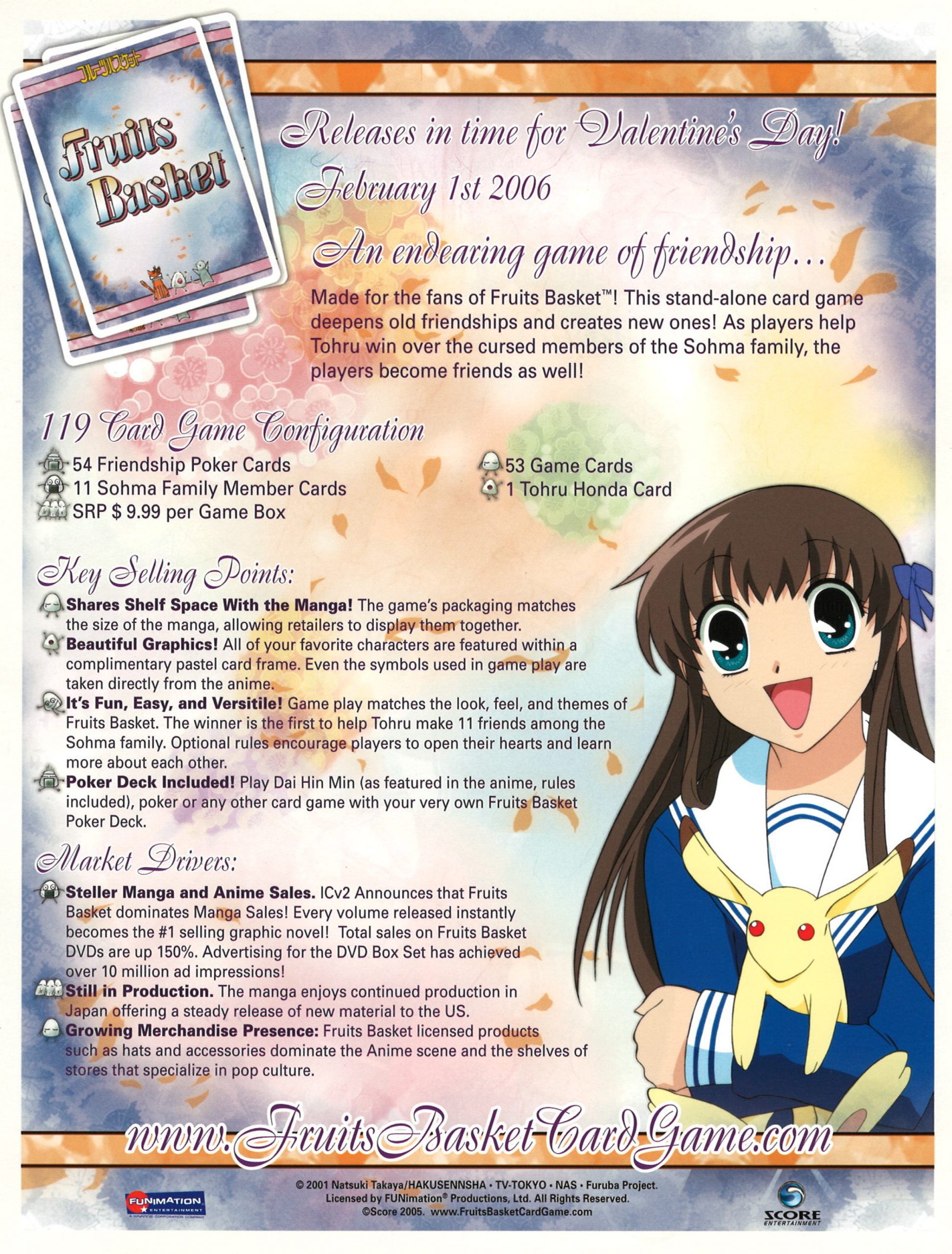 This page is dedicated to the Fruits Basket Card Game: Friends of the Zodiac. It was a stand-alone game, and one of the few non-TCG game releases by Score Entertainment. It was first released in 2006.